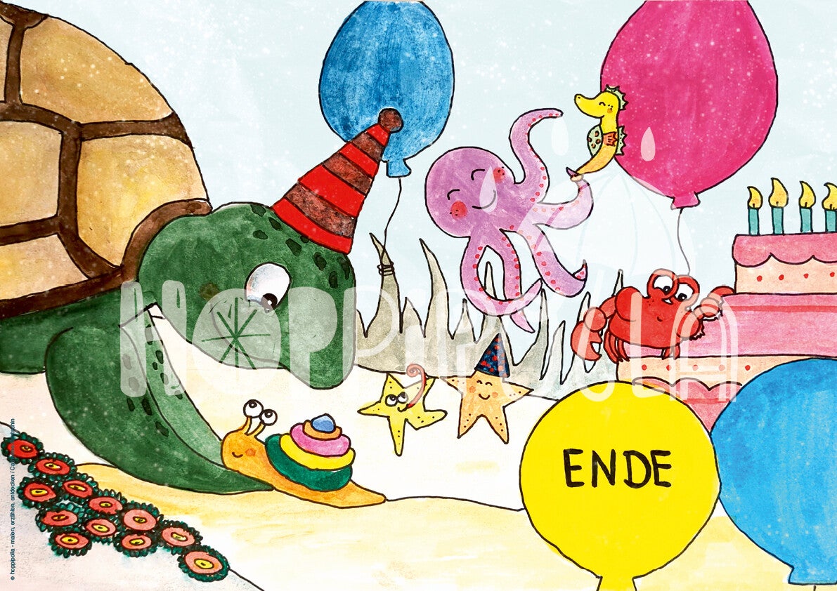 Schildkröte Kiwi feiert Geburtstag – und Theodor, die Krabbe sowie Lou, das Seepferdchen machen sich auf den Weg zur Party.